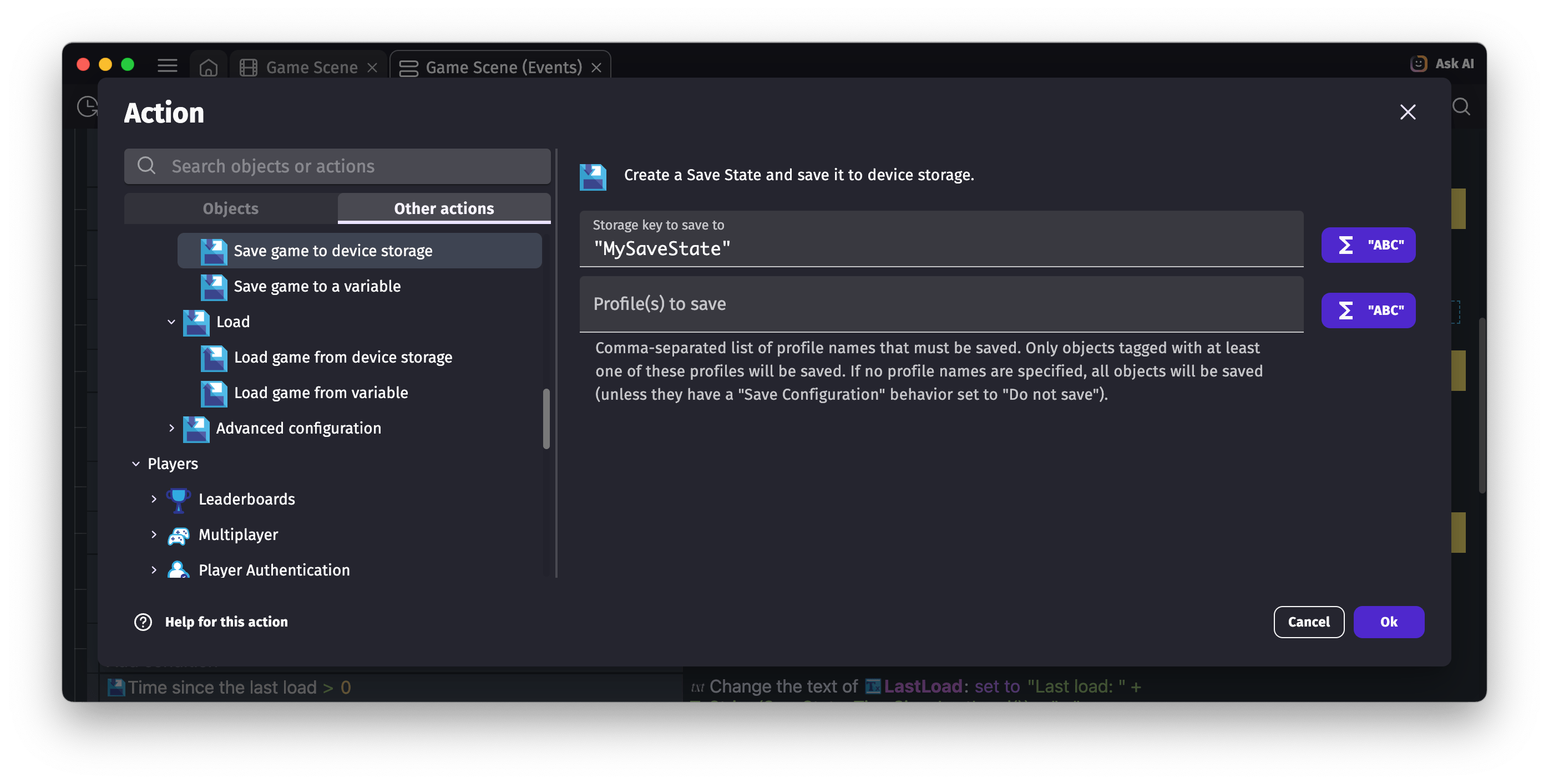 • Change the save configuration of a scene data: this does the same for the scene variables, timers, layers, asynchronous actions (Wait X seconds).