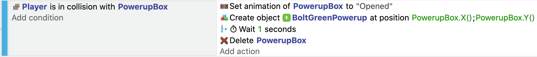 Use the action to wait a bit before launching an action. For example, here we create a power-up item when the player touches a power-up box, and then delete the box 1 second after: