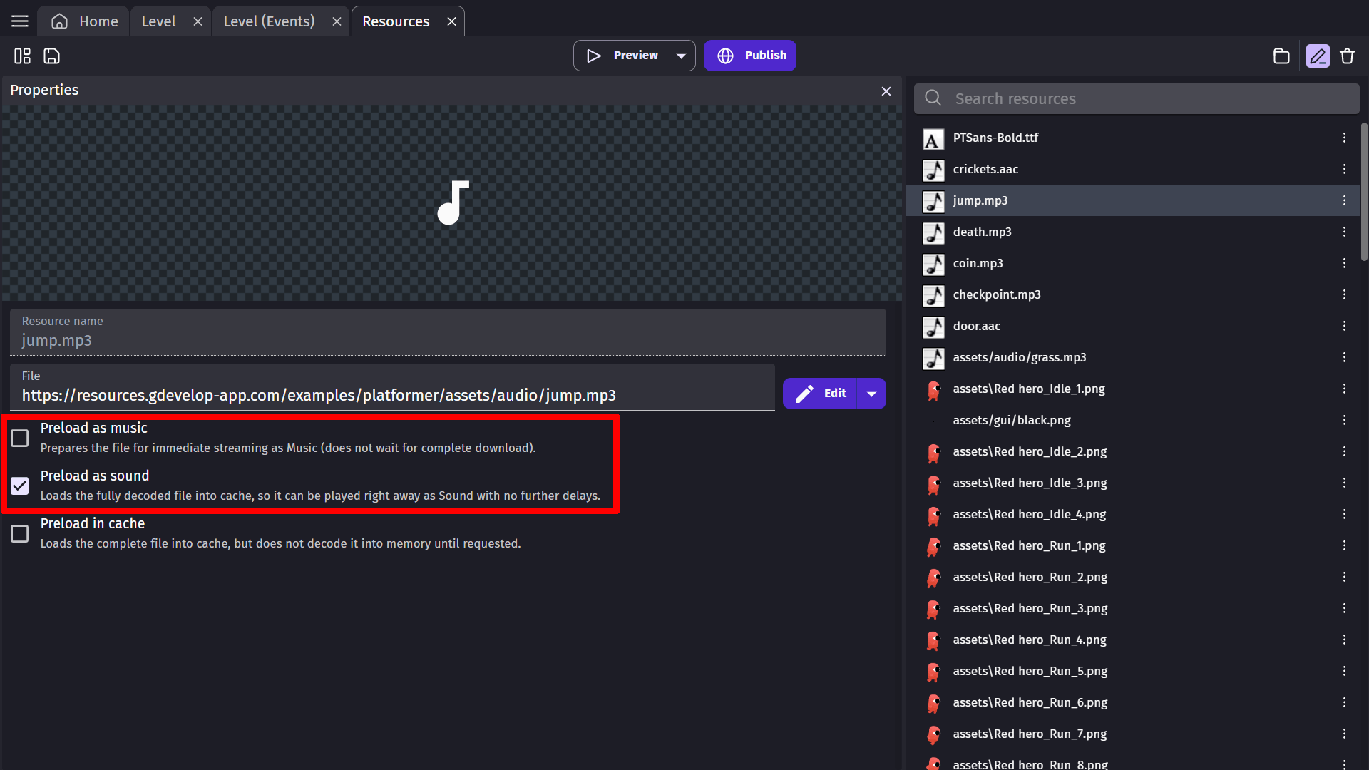 This allows you to preload audio files as music/sound, making them start quickly as you don't have to wait for the audio to load. If the appropriate toggle isn't checked, the first time this audio file is played it may be distorted as it's loaded in.