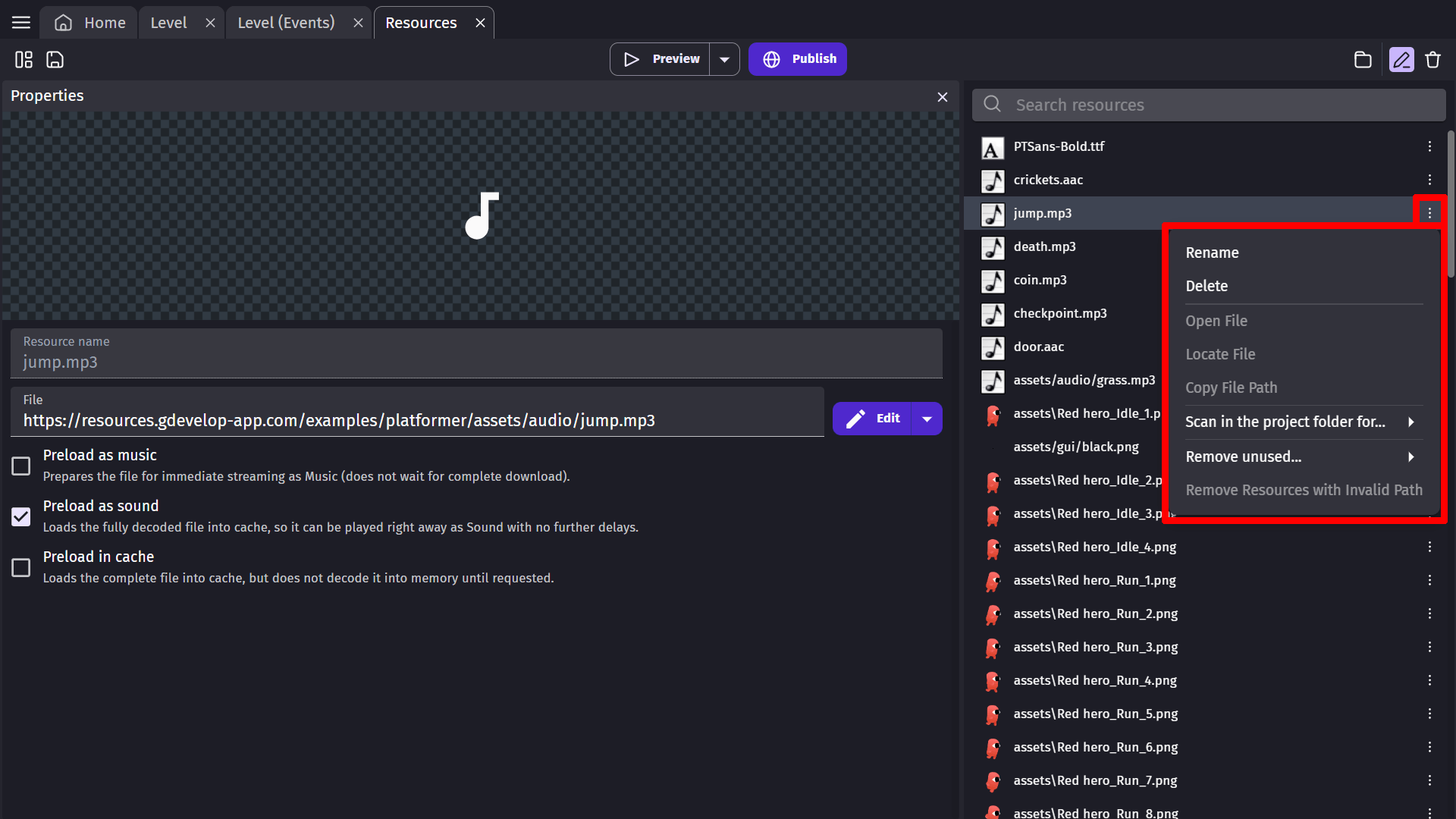 For more options related to each resource file, you can open a drop-down menu by clicking on the three dots to the right of the resource name, or right click on the resource.
