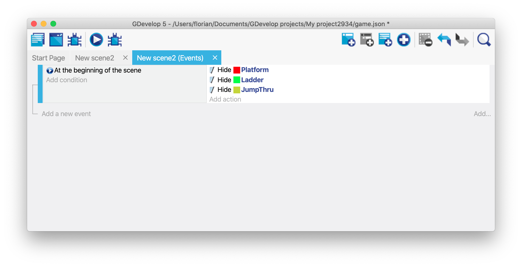 Hide the invisible obstacles/platforms at the start of the scene using events: