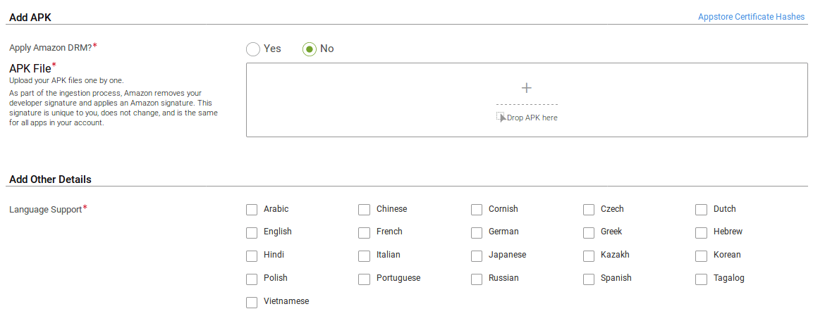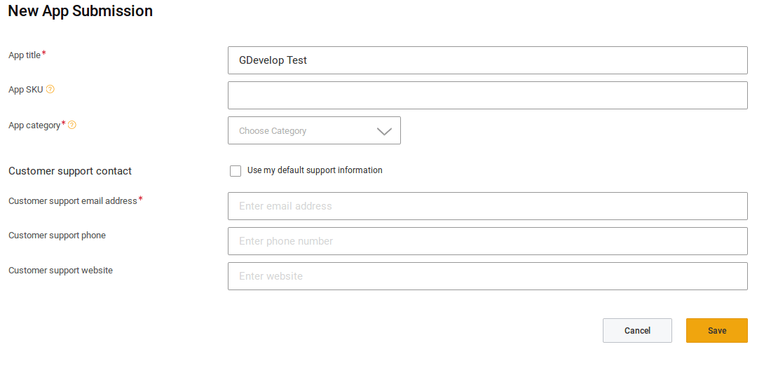 After you click on Android, a New App Submission page appears for you to enter basic information about your app.