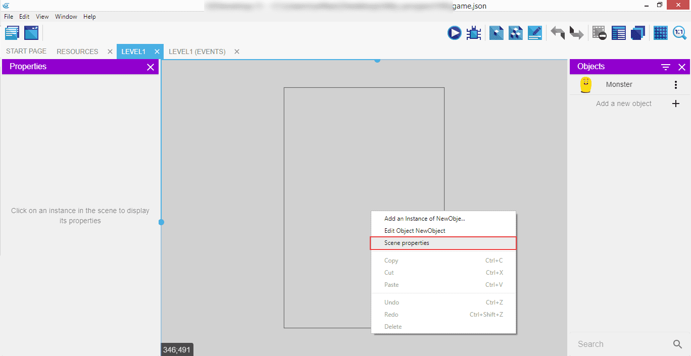 To make the scene look a little bit more interesting we will add a background color to it. Right click on the scene, and select "Scene properties" from the context menu. It will open a popup with some options - we are interested in setting the "Scene background color" to something on which the Monster will look stylish.