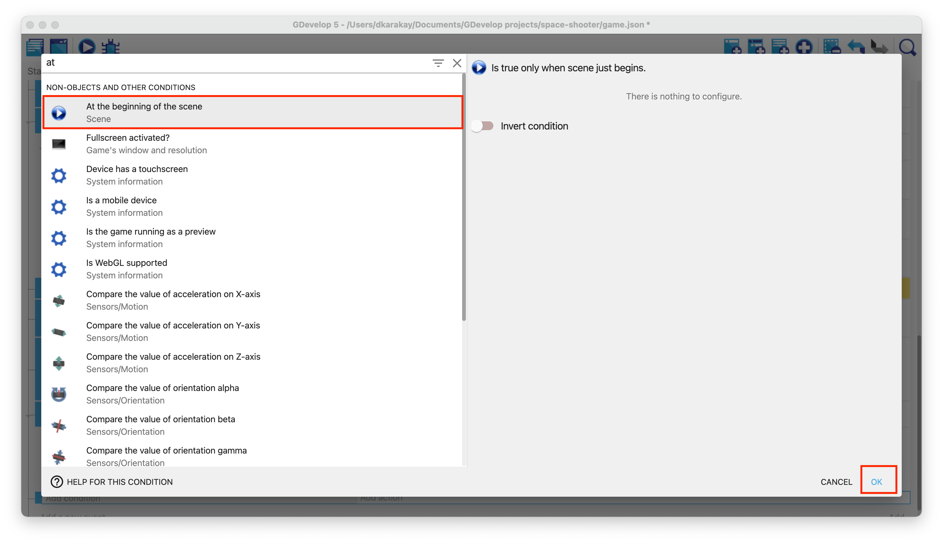 Firstly, we will add soundtrack music to our game. This music will be played at the beginning of the game. Hence, we have to determine when the scene starts. We are using a built-in condition called "At the beginning of the scene." So, open the Events tab and add a new event.
