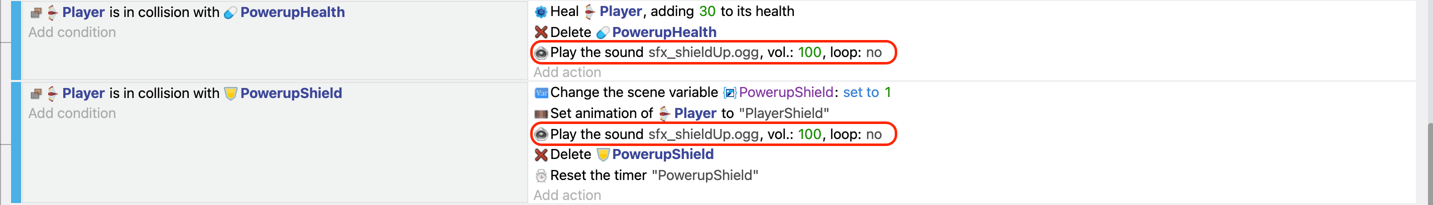Finally, we will add a sound effect that will be played when the player collects a powerup. Go to the Player's collision with powerup events. Add a new action to play a sound. Select "sfx_shieldUp.ogg" from the assets folder, set volume to 100, and pitch to 1.